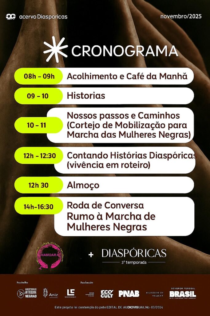 - 10h – 11h: Nossos passos e Caminhos (Cortejo de Mobilização para Marcha das Mulheres Negras)